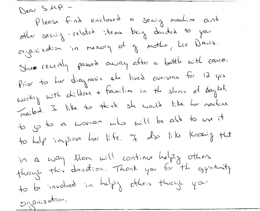 I received a machine and a generous financial donation today with this note…
