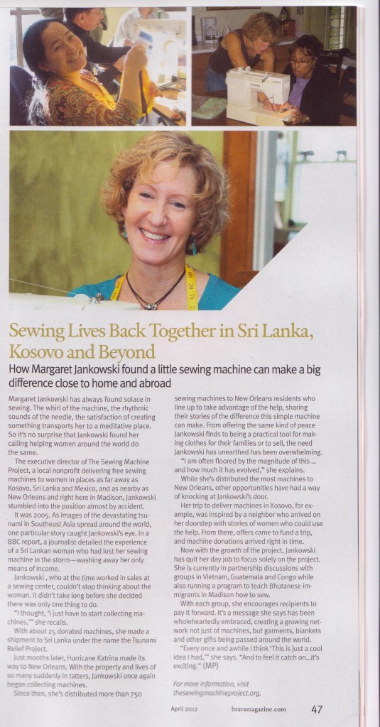 Brava Magazine celebrates local women making a difference by Margaret | Mar 31, 2012 | General, In the News | 1 comment I was thrilled to be included in Brava magazine’s April issue. Here’s the article! Thank you, Brava! 1 Comment JVS on April 1, 2012 at 8:55 am You really have made a difference in so many lives. Good works and keep sewing! JVS Reply Submit a Comment Cancel replyYour email address will not be published. Required fields are marked *Comment * Name * Email * Website Notify me of follow-up comments by email. Notify me of new posts by email. Δ This site uses Akismet to reduce spam. Learn how your comment data is processed.