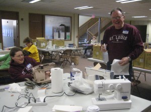 We had a huge, wonderful Volunteer Day this past Saturday…30 volunteers, 135 machines, a 16 foot truck, 4 giant pizzas and more smiles and love than one can convey on a page. We’ve received so many machines in recent months that we’ve had a hard time keeping up so I contacted those who’d shown an interest and asked if they’d be available. Can you come and help “sew in” machines??