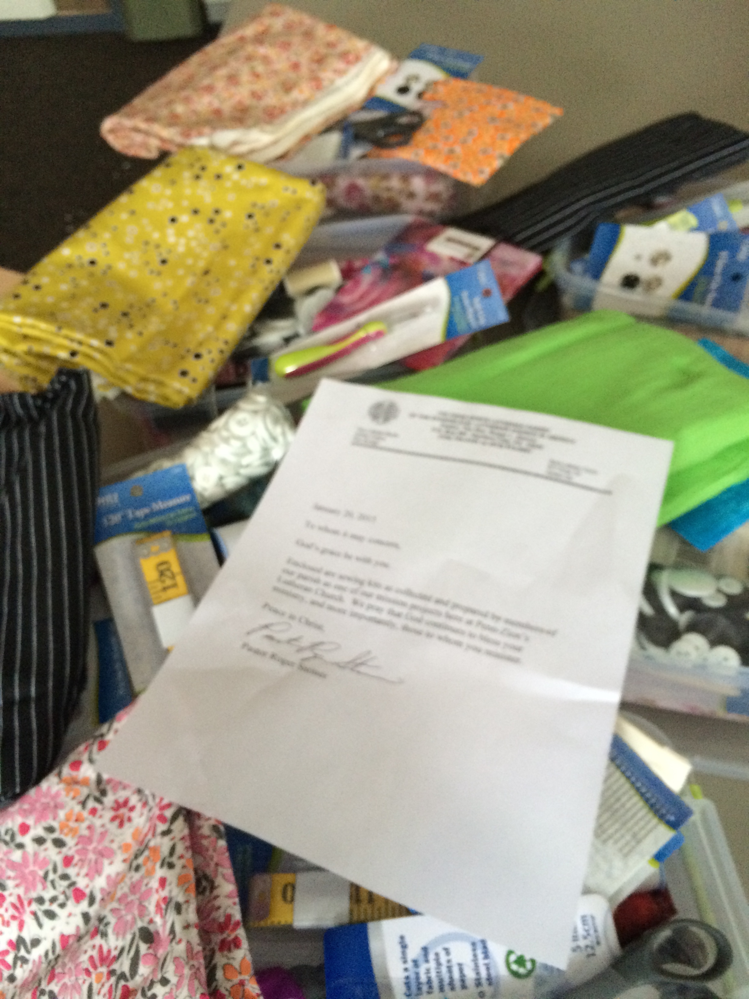 Our storeroom at the church is a Sunday School classroom and it’s packed to the gills with sewing machines and supplies–truly an abundance of gifts from donors near and far. I made a space on the table and noted the donor’s city before cutting open the box. Harrison City, Pennsylvania. The box felt heavy enough to be a sewing machine but rattled like something else. I carefully cut open the box and there, inside were tidy plastic boxes filled to the brim with fabric and sewing supplies. The note read:” Enclosed are sewing kits as collected and prepared by members of our parish as one of our mission projects here at Penn-Zion’s Lutheran Church. We pray that God continues to bless your ministry, and more importantly, those to whom you minister.”