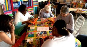 Soon other women from the neighborhood began to join them. Members of the Birmingham Quilt Guild donated sewing supplies and the Tuesday morning quilters began making quilts to donate to local charities. As their numbers grew the Tuesday quilters moved to larger quarters. Lillis and Miss Annie began to dream about the possibilities that were opening. Wouldn’t it be great if the women could display their art in a quilt show? Perhaps they could become a co-op and cultivate the skills needed to do piecework sewing for a profit. And maybe one day the women raising kids could work from their homes for local companies that need sewers. But first they needed a name. After much discussion, the group decided to call itself the Bib and Tucker Sew-Op.